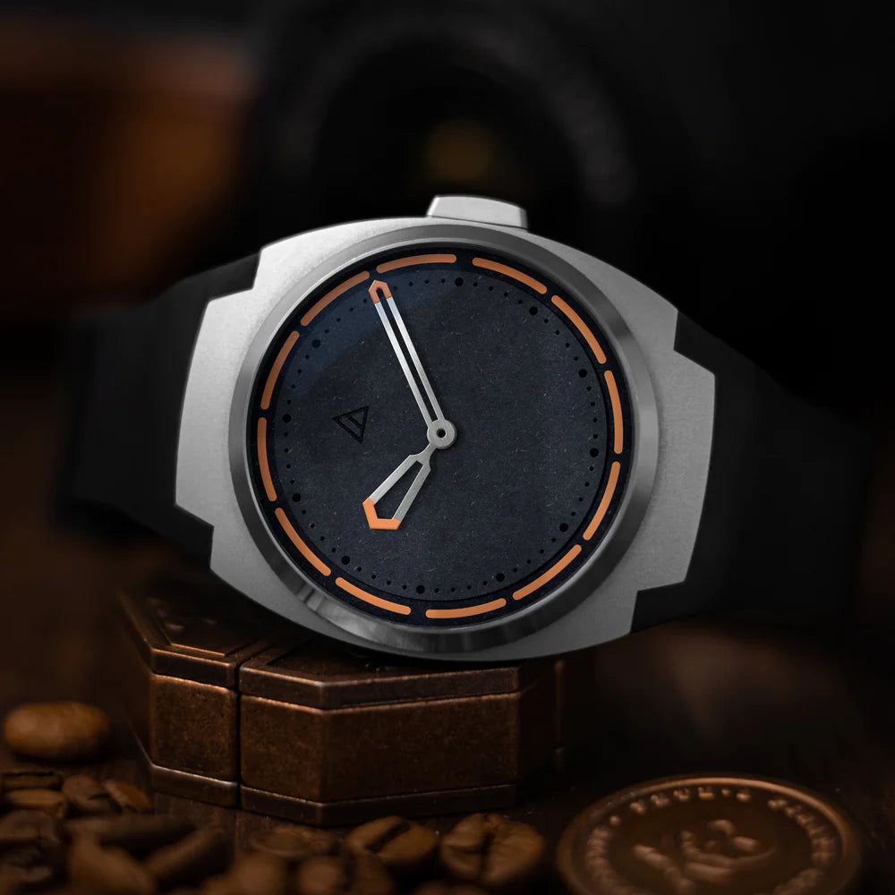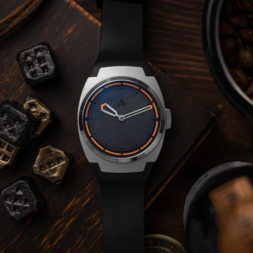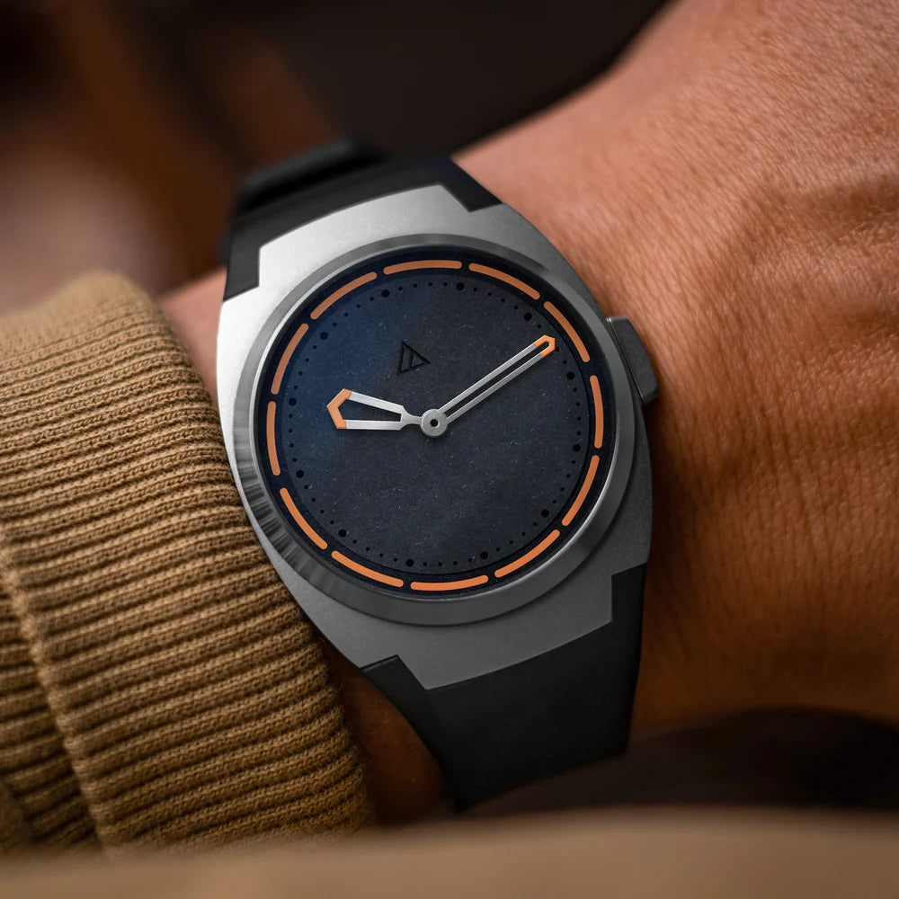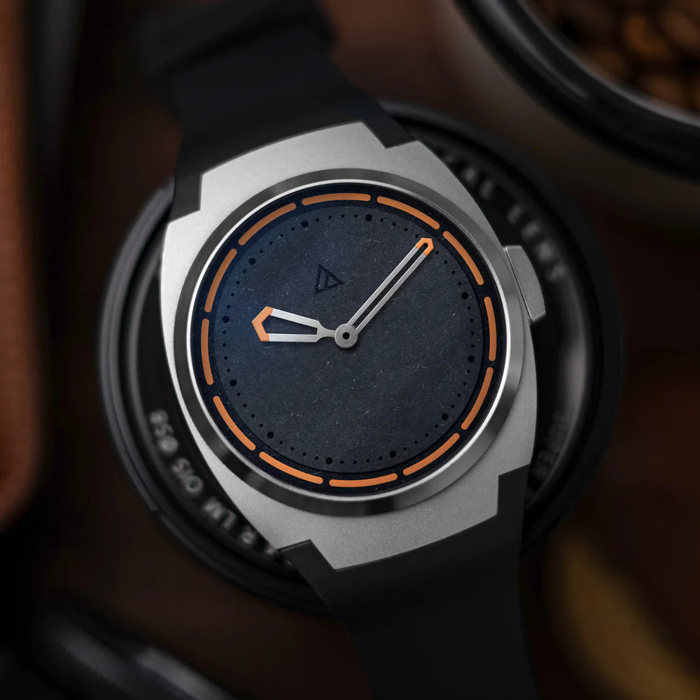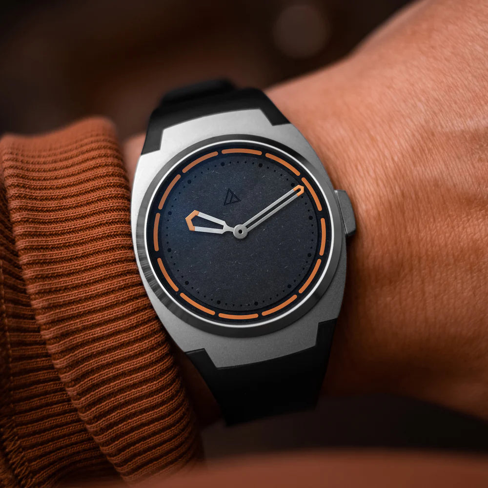 Housed in a 316L stainless steel case CNC-milled and assembled in Copenhagen, the Arcanaut Arc II — D'Arc Matter Pongo Orange has a matte micro bead blasted finish, with hand-polished highlights applied in-house by our Danish watchmakers. The case features Arcanaut's signature "Pentablock" crown, the shape of which follows the form of the Arc case perfectly.
