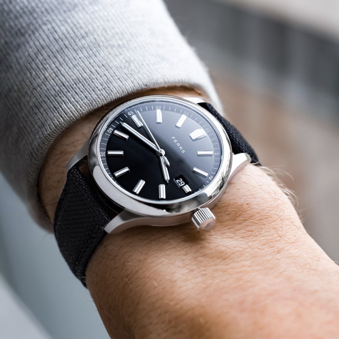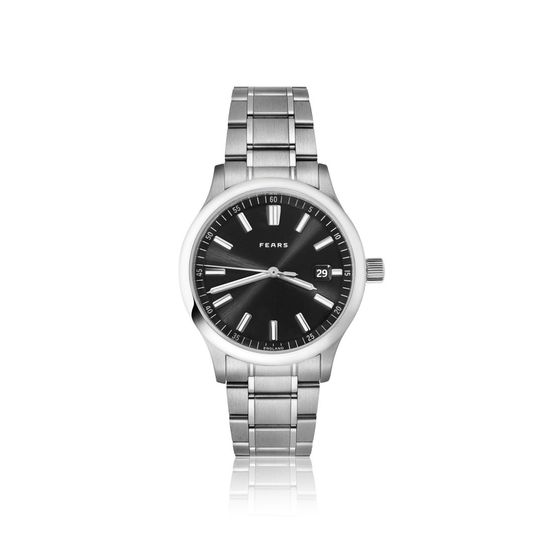 Top-grade La Joux-Perret G100, automatic winding, 24 jewels, 28,800vph (4Hz) and 68 hr power reserve. Dial colour-matched date disc featuring Fears’ bespoke ‘Edwin’ numerals. Finished with Côtes de Genève, Rhodium plating and blued screws. Custom decorated rotor featuring the ‘Bristol Flower’. Made in Switzerland