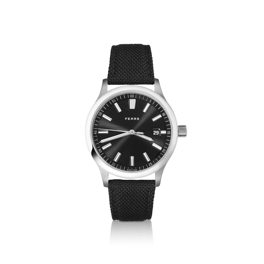 Taking its inspiration from the glossy black feathers of a raven bird this dial features a sophisticated black with a sunburst pattern etched on to the dials surface that catches the light beautifully. White and silver printing contrast the darkness of the dial with hands and baton appliques all plated in precious Rhodium.