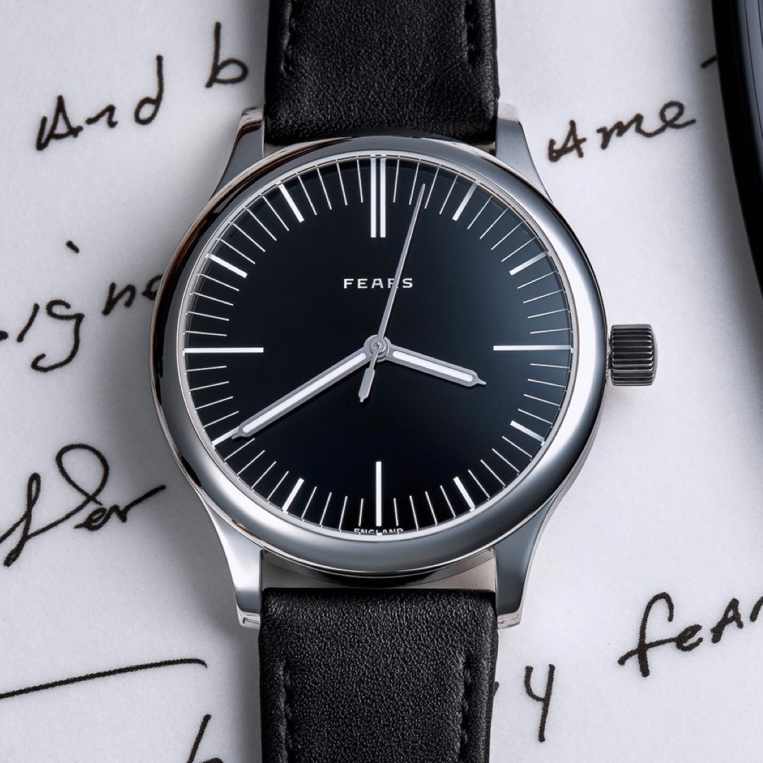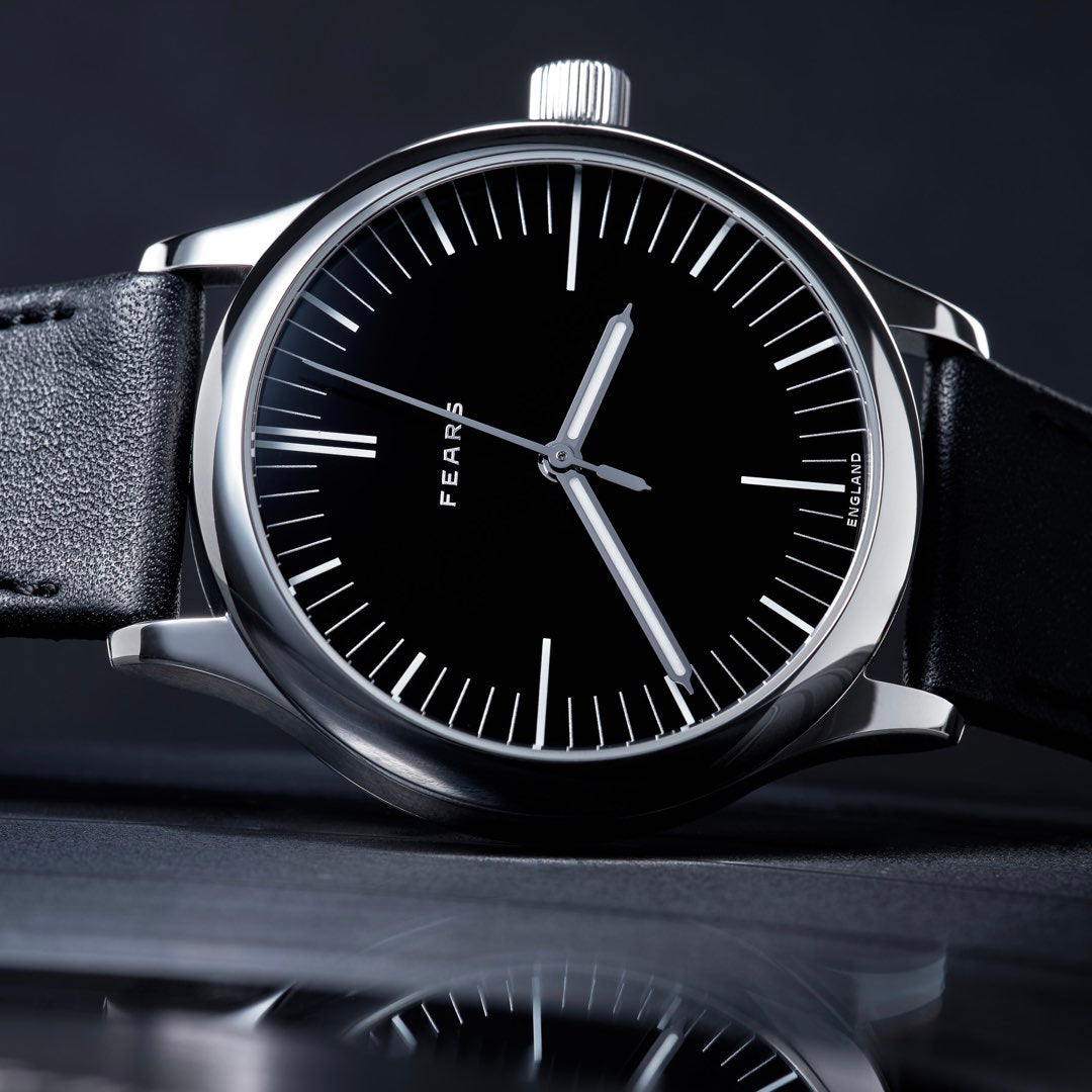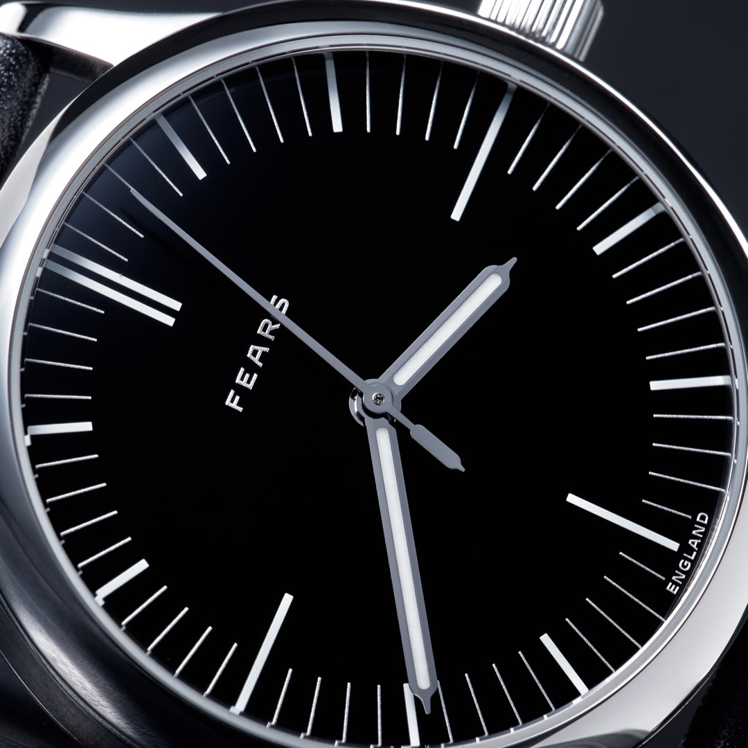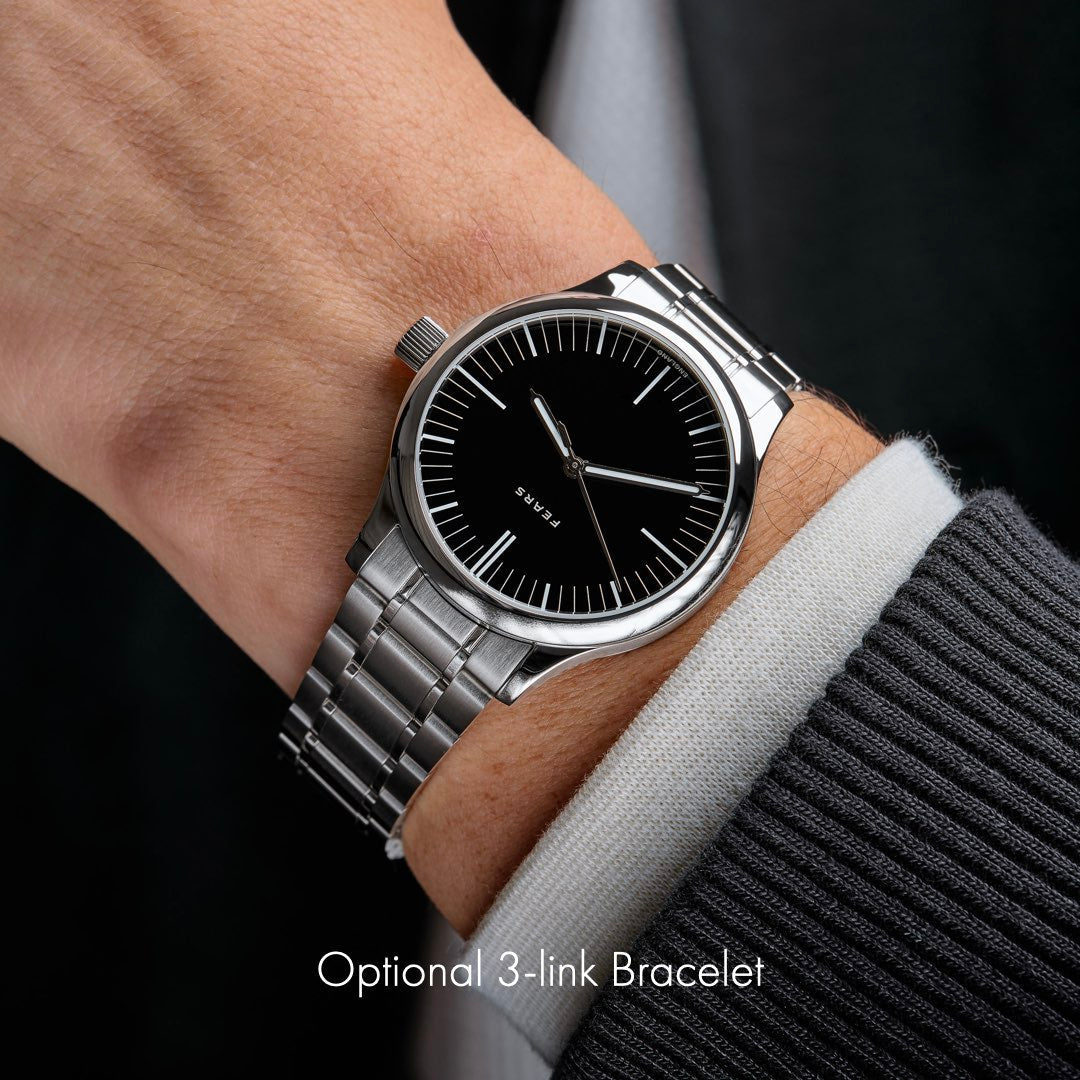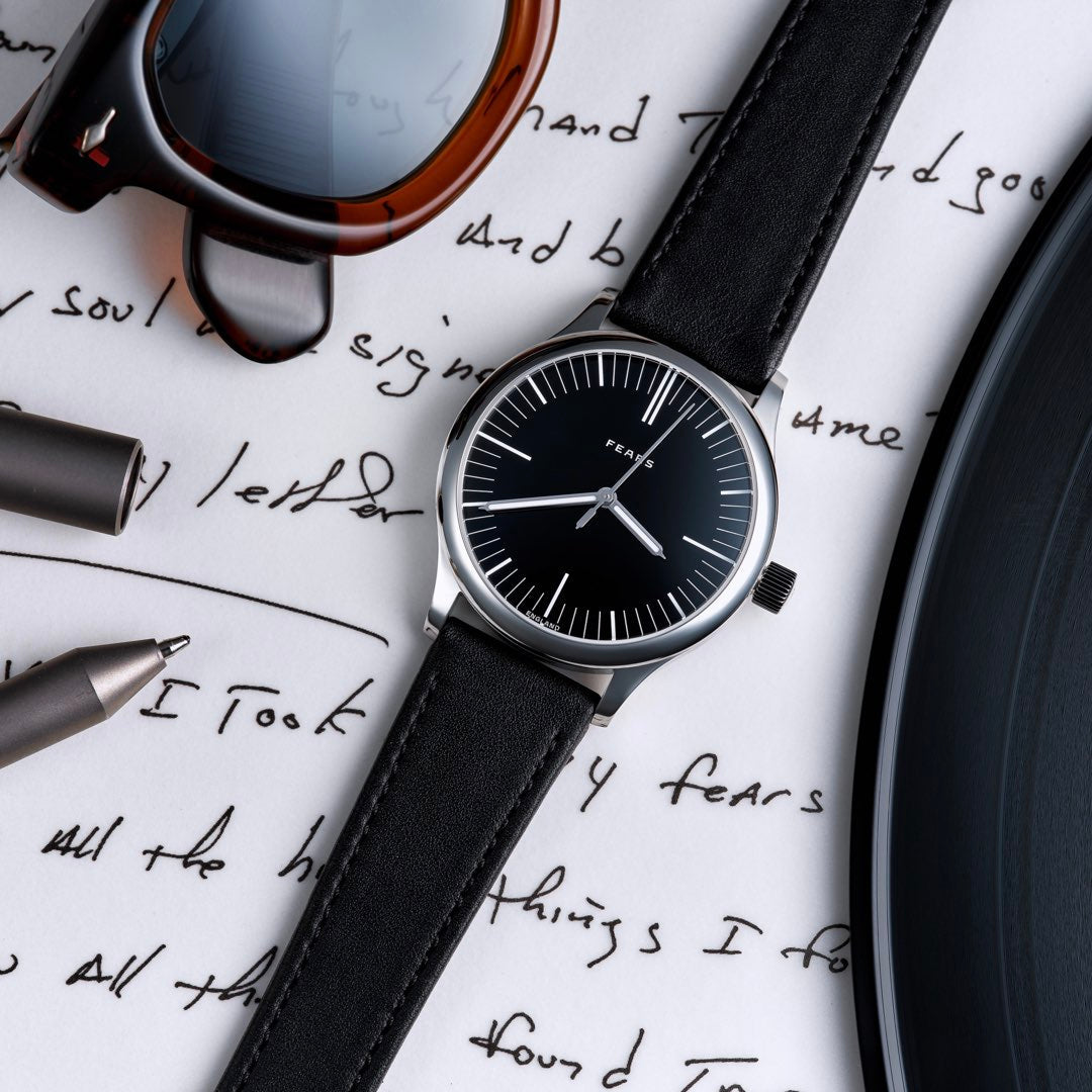 A deep black stone dial made from onyx. The graphical nature of the silver and white printed stick indices – inspired by mid-century scientific dials – further enhances the chicness of this limited production watch.