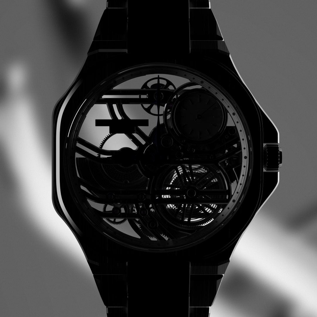 - Small seconds counter at 1:30, engraving three-dimensional horizontal ripples, satin-finished by hand, black PVD treatment