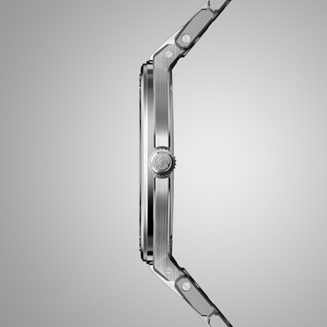 - Square bezel with rounded shapes, polished profile, satin-finished surface