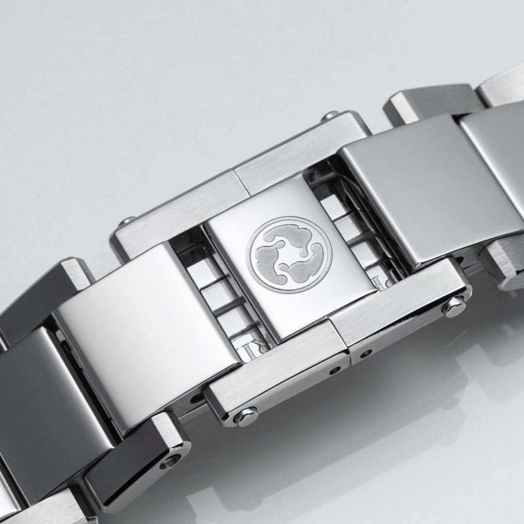 - Three-row integrated polished/brushed steel bracelet with personalised folding buckle with the Maison’s logo