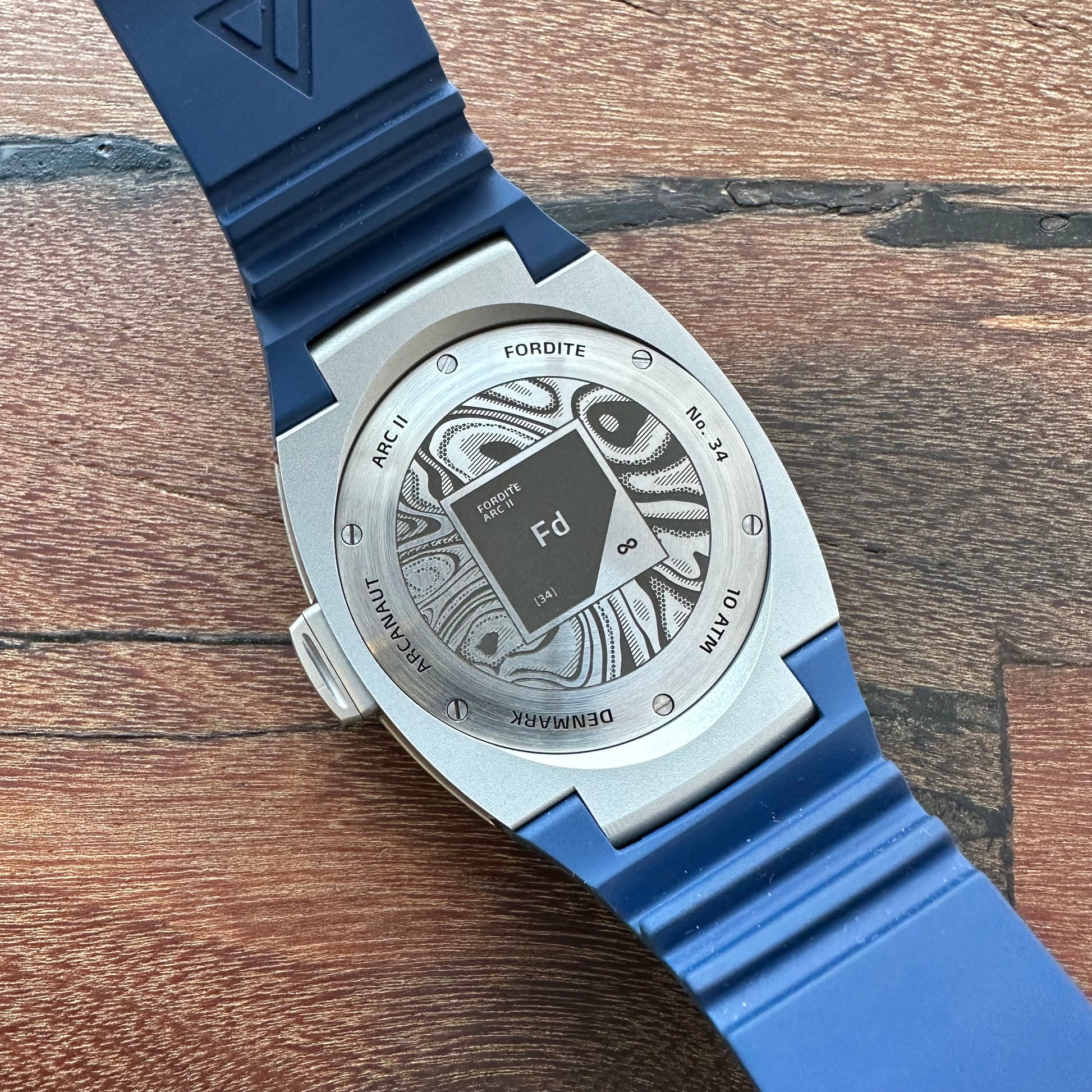 Nowadays, genuine Fordite (which is far more compact and durable than synthetic or homemade Motor City Agate) is used in jewelry production. Arcanaut’s materials maestro, James Thompson, was the first to refine the process for using it in high-end watch design, and now the Arcanaut ARC II - Fordite pieces form an important cornerstone of our collection.