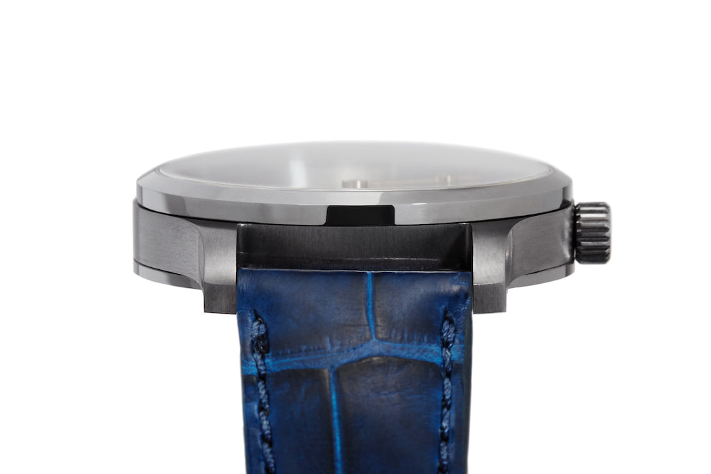 - Untreated palladium dial with tantalum chapter rings, blue enamel ink with blue steel hands