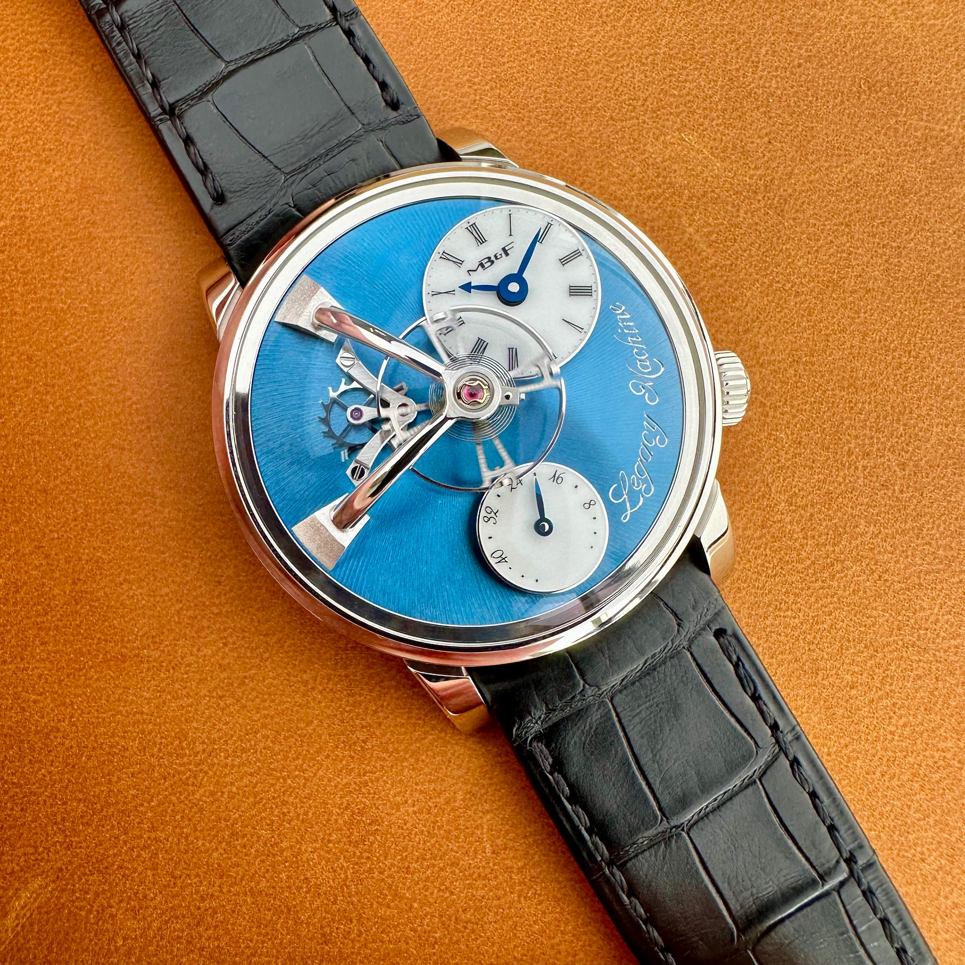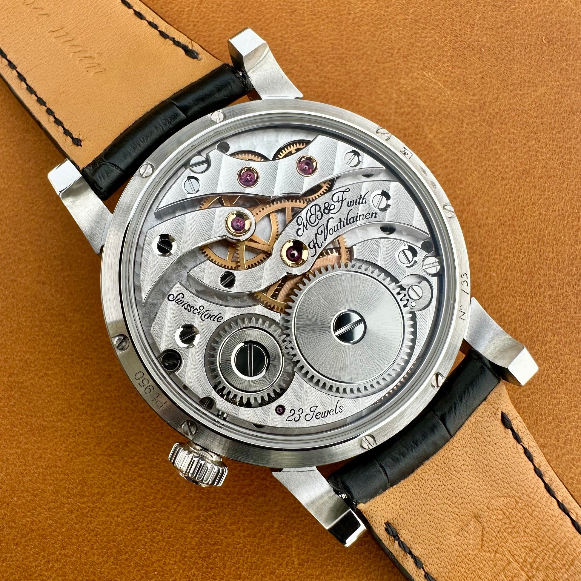 - Fine finishing: superlative 19th century-style hand finishing throughout; internal bevel angles highlighting hand craft; polished bevels; Geneva waves; hand-made engravings