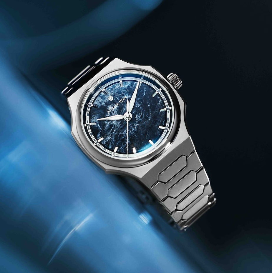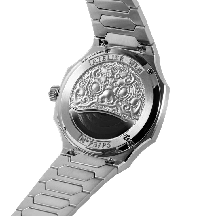 The case and bracelet of Perception 漩 (Xuán) have been crafted out of 904L stainless steel, and the watch is powered by a customised, extra-thin Peacock SL1588A calibre.