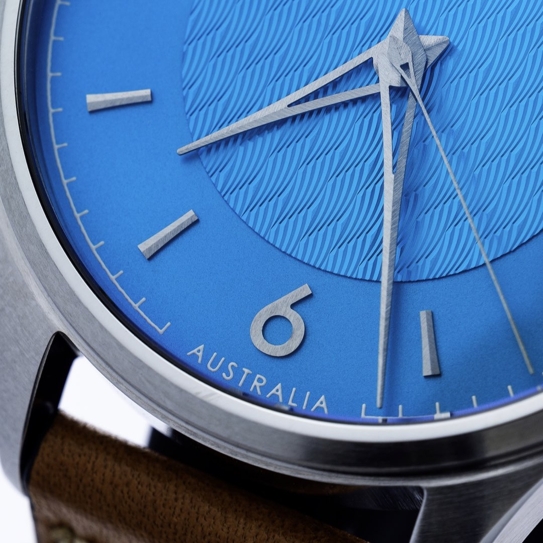 - Dial: Grade 5 titanium anodised base dial, with guilloche “Curl Curl waves” pattern, Grade 5 titanium applied numeral with straight graining, Grade 5 titanium hour markers with “feathered” facetting, Grade 5 titanium minutes, seconds and hour hands with “feathered” facetting