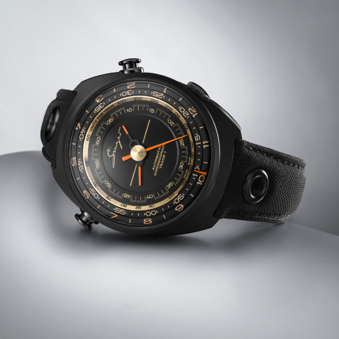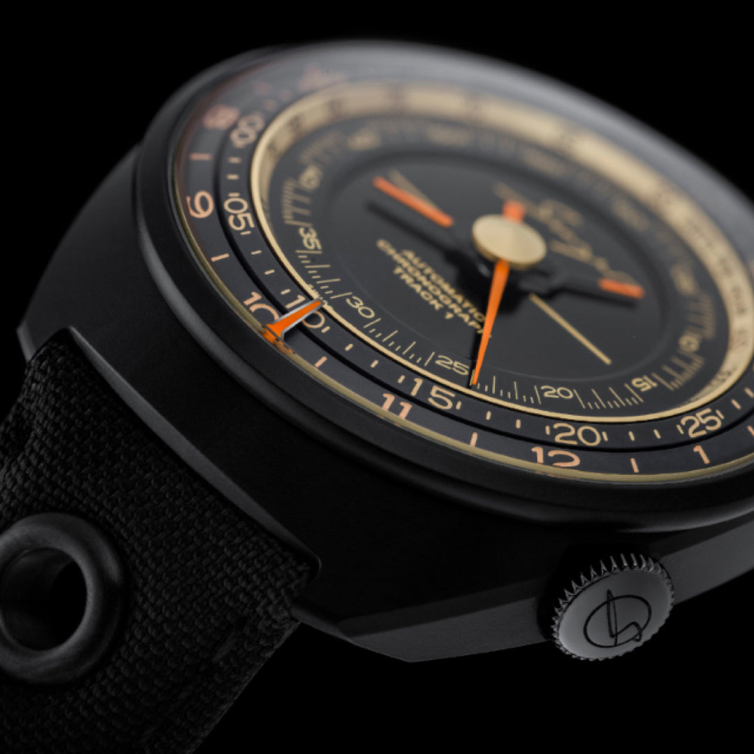 The Track1 – Bold Edition is showcased in a ceramic-aluminum black case, crafted by electro-plasma oxidation. The surface layer of a special, aerospace-specification aluminum alloy is transformed into ceramic. The result of this high-tech process is a super-black case combining exceptional scratch, wear and corrosion resistance with the lightness of its aluminum core.