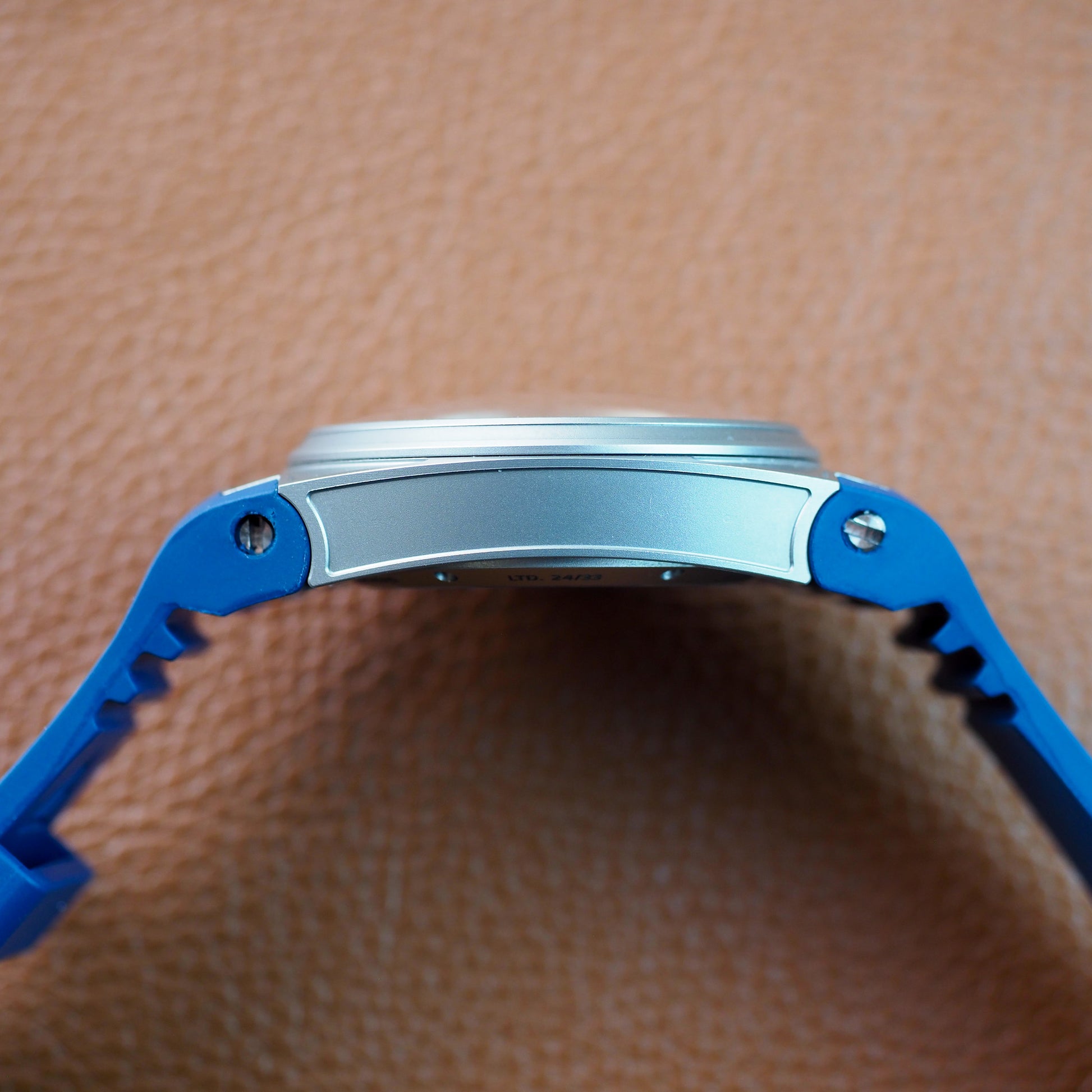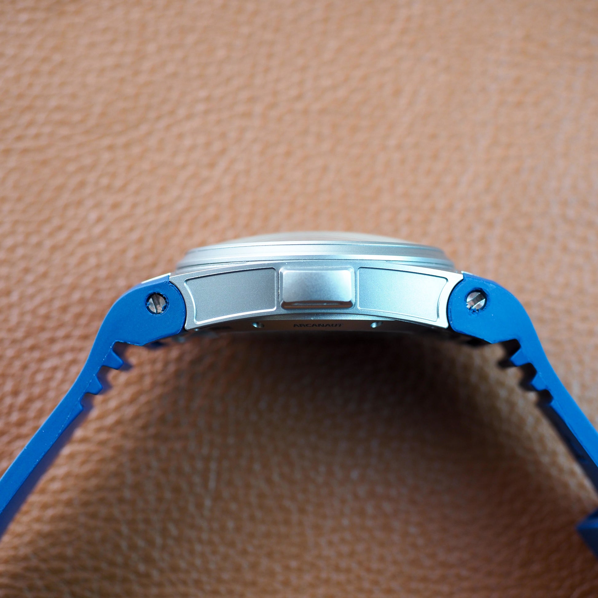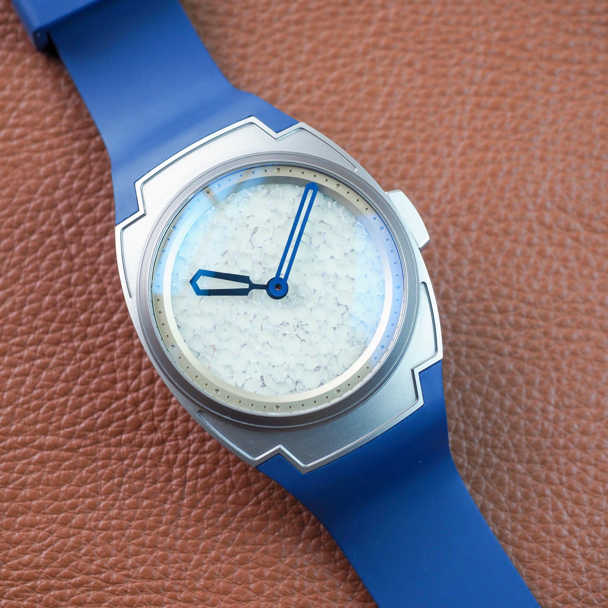 - Dial: Solid lume disc topped with cloudy-resin-filled Aerospace grade aluminium foam, made by James Thompson in Gothenburg, Sweden