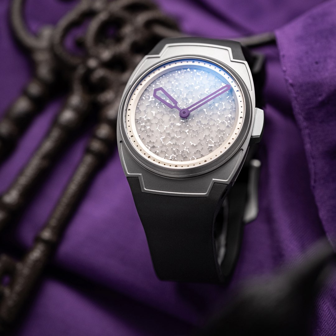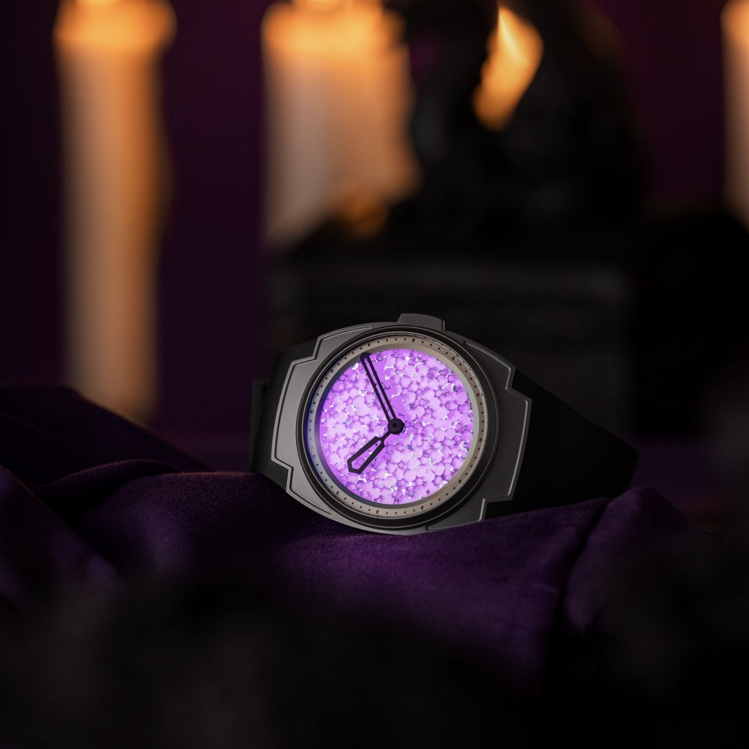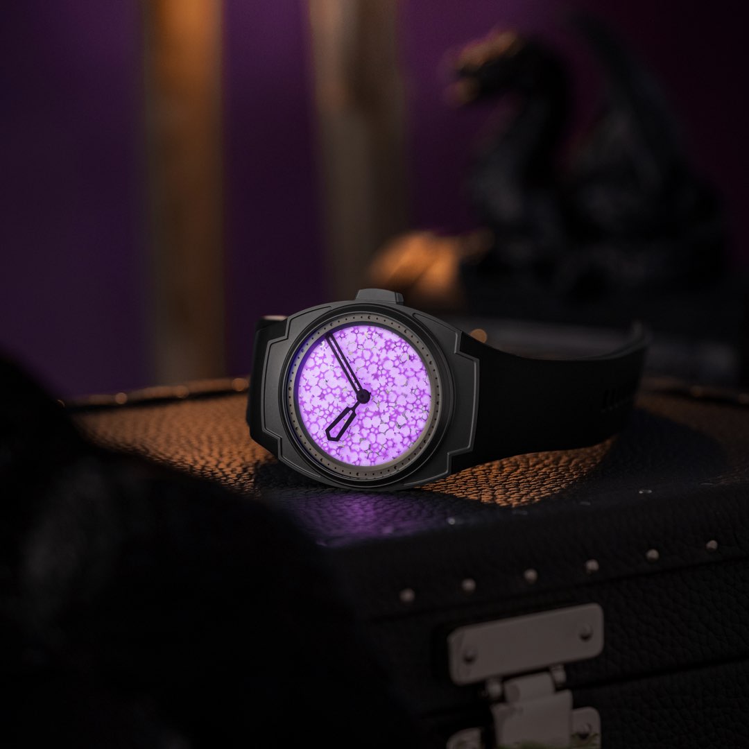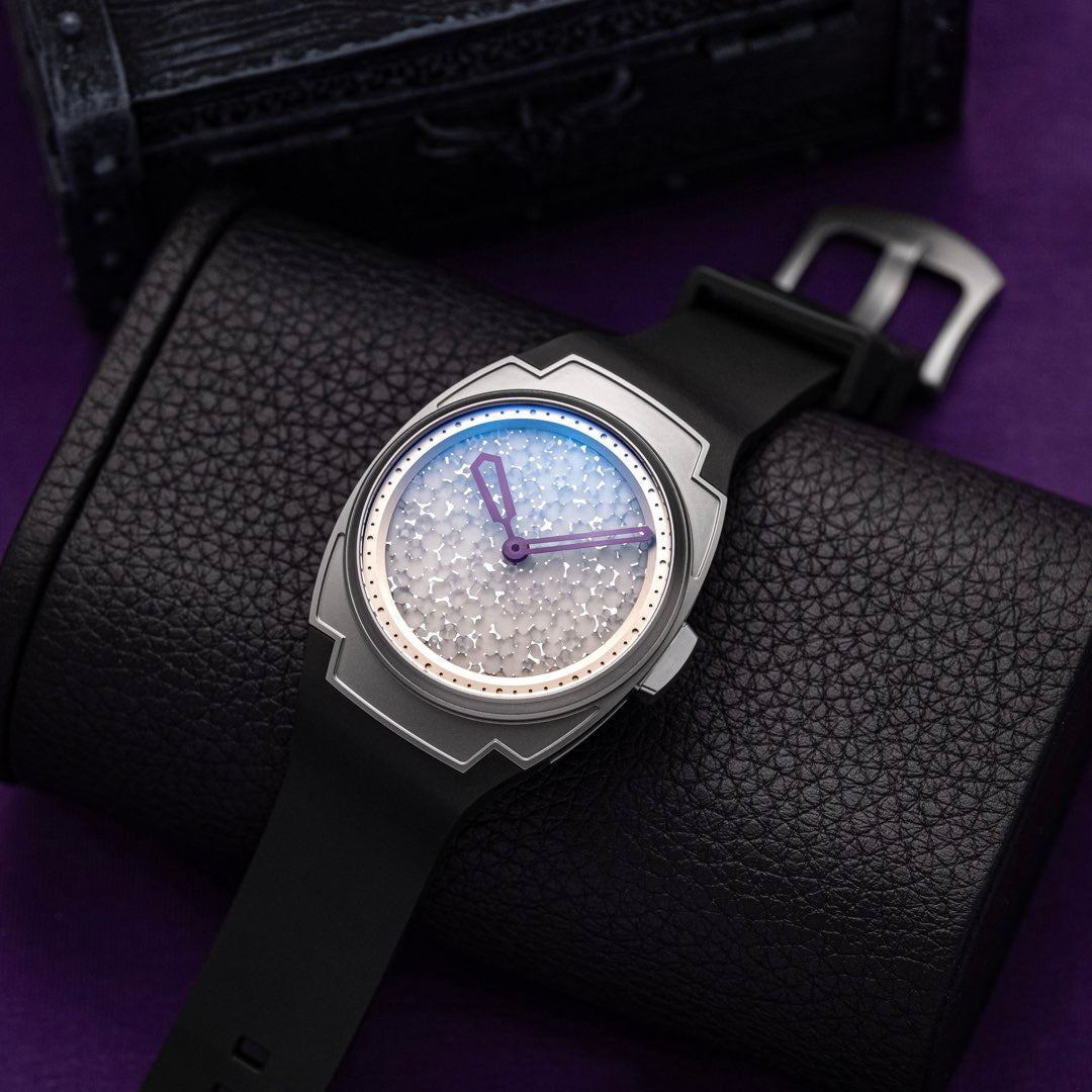 The Phantom revisits the complex, multi-layered dial construction first seen in the Bonehead. A solid disc of Super-LumiNova sits beneath a resin-injected layer of aerospace-grade aluminium foam, topped by a German Silver chapter ring — now re- engineered as a structural “carrier” for both lume and foam. The effect is no less hypnotic, but this time, it glows in violet tones that feel deeper, cooler, and more enigmatic.