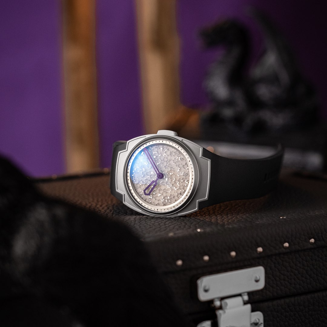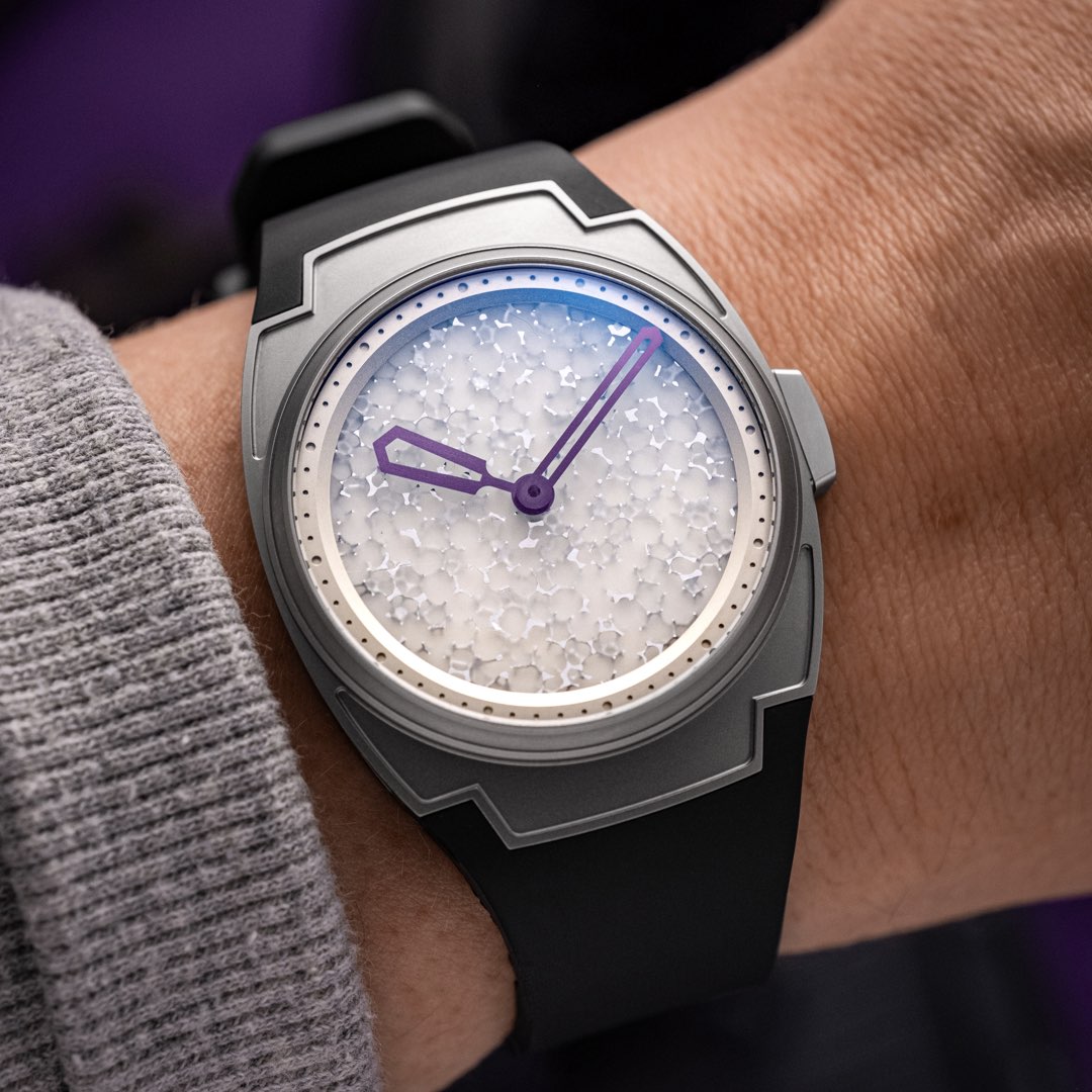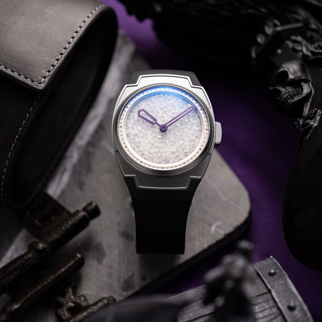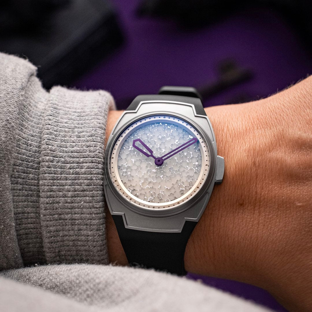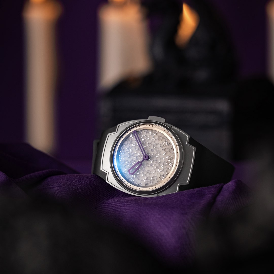 The Phantom revisits the complex, multi-layered dial construction first seen in the Bonehead. A solid disc of Super-LumiNova sits beneath a resin-injected layer of aerospace-grade aluminium foam, topped by a German Silver chapter ring — now re- engineered as a structural “carrier” for both lume and foam. The effect is no less hypnotic, but this time, it glows in violet tones that feel deeper, cooler, and more enigmatic.