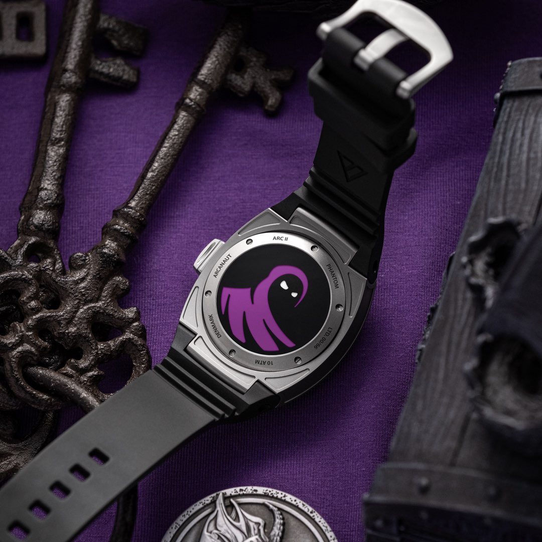 The key colour for the Phantom is purple. Arcanaut chose this colour because it is a) one of the naturally achievable oxidization colours when heating steel and thus looks very natural in comparison to wilder tones, and b) because of how well it pairs with the uncoated German silver of the chapter ring. However, to achieve the iridescence for which their coloured hands have become known, Arcanaut opted to PVD coat the laser-cut stainless steel handset instead. This particular shade is both special and subtle and ties the whole design together, especially when considered alongside the casebook’s purple-cowled phantom.