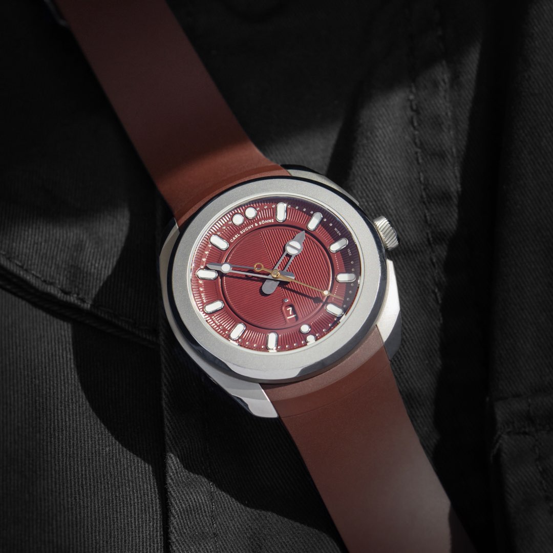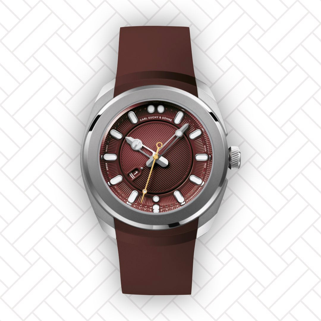 Embodying elegance and sportiness, the Belvedere Bordeaux captivates with its deep, luxurious red. This unique hue not only stands out but also exudes a sense of rarity and sophistication, making it highly desirable. The dial features a luminous golden second hand and Super-LumiNova-filled indices, highlighting the meticulous craftsmanship and attention to detail that defines Carl Suchy & Söhne.