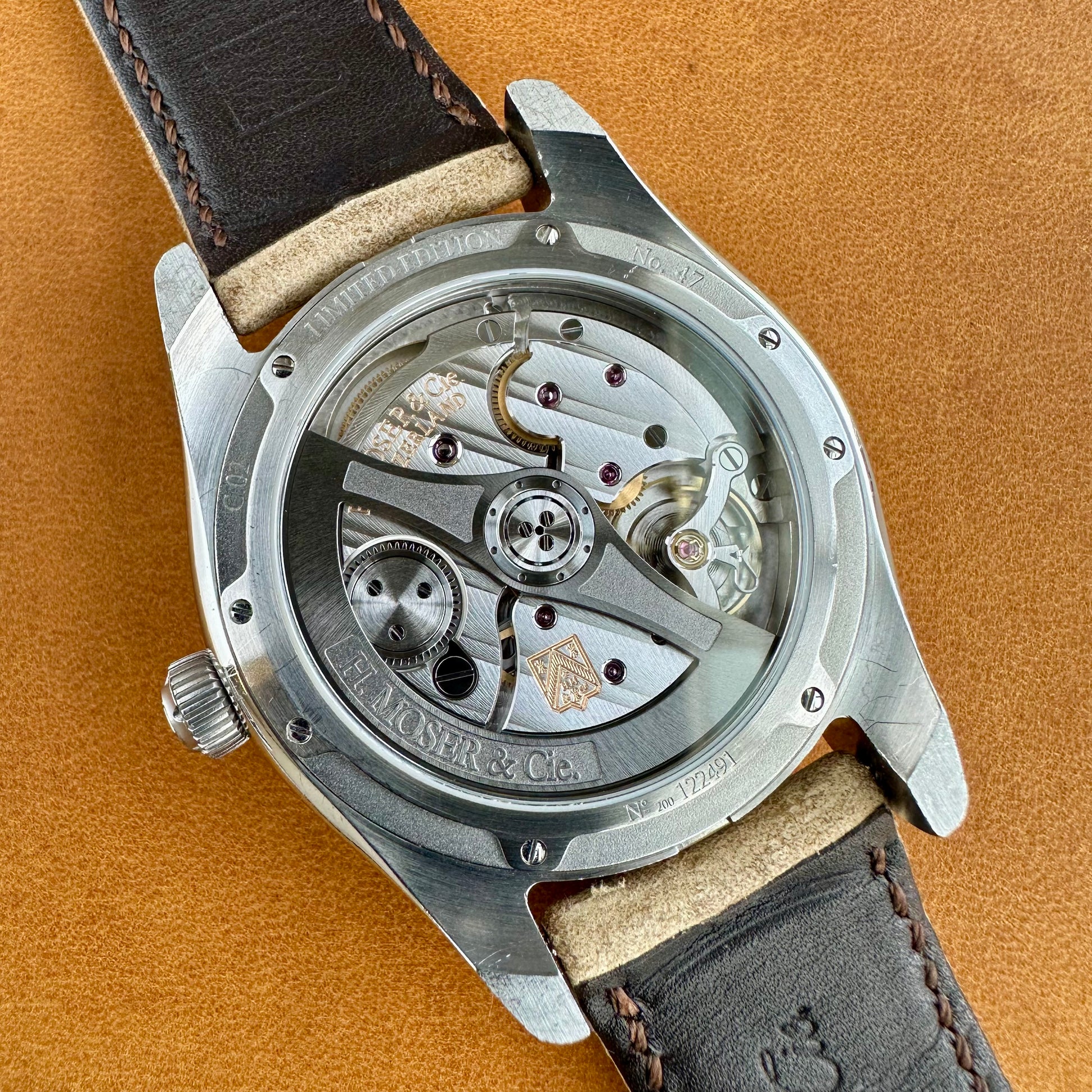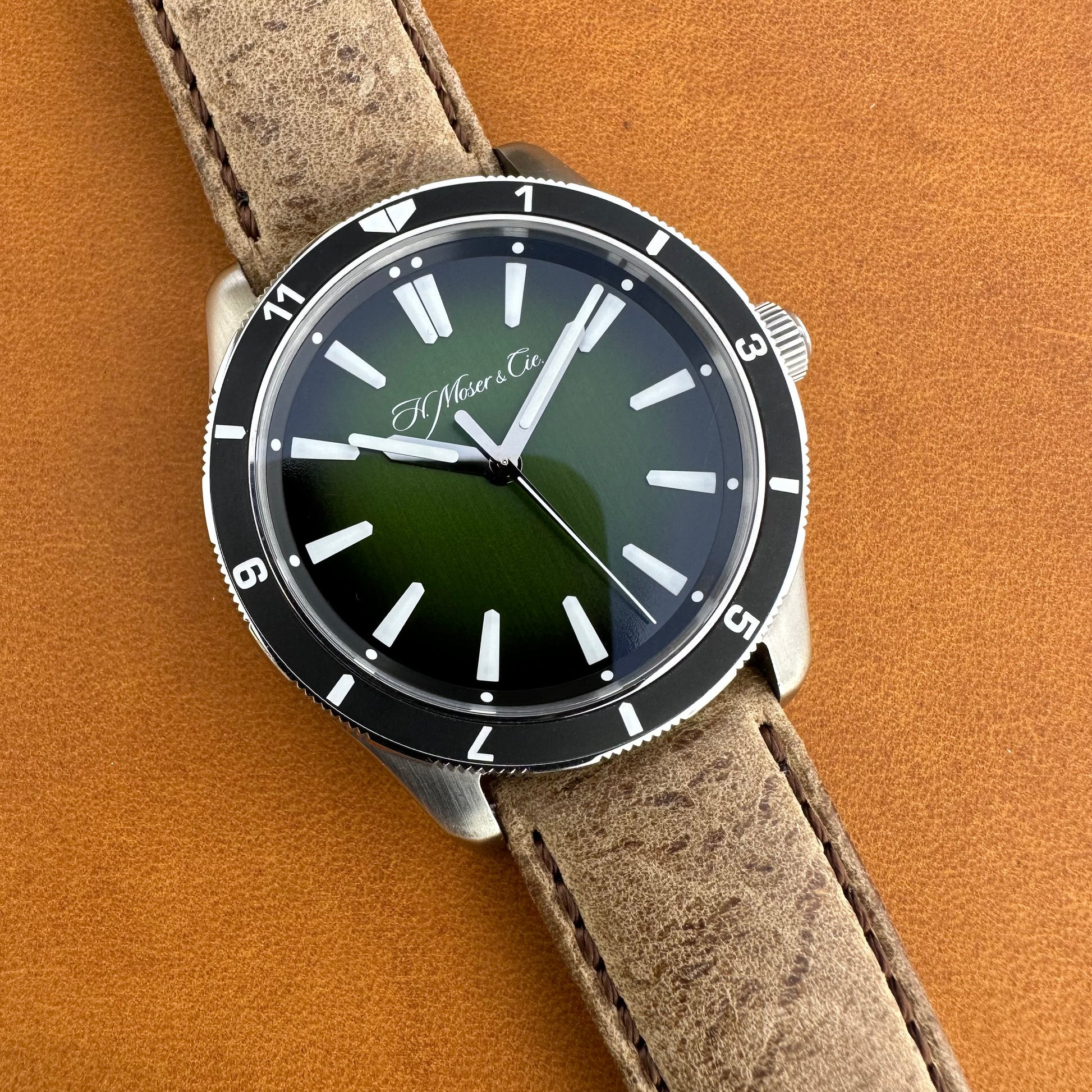The C.02 represents the missing link between H. Moser’s two sports watch lines – the Pioneer and the Streamliner. Designed to be a daily wear, the C.02 is built around the Pioneer case and is powered by H. Moser’s in-house HMC 200 calibre. The case has been modified to fit a bi-directional, 60 click, 12 hour bezel to allow for tracking two time zones and a box crystal has been fitted to the case to ensure a shorter height. The dial – a degradé green griffé dial borrowed the color from the Pioneer line and the dial treatment from the Streamliner line. The effect of “Collective Green” is difficult to describe. In direct sunlight, the green dial shines bright; in lower lighting it fades into a dark olive. The indices on the dial are based on the Pioneer dial but cut from three-dimensional Globolight® luminous material. The handset continues the trend of three dimensionality, with Globolight® inserts fitted perpendicularly to the hands.