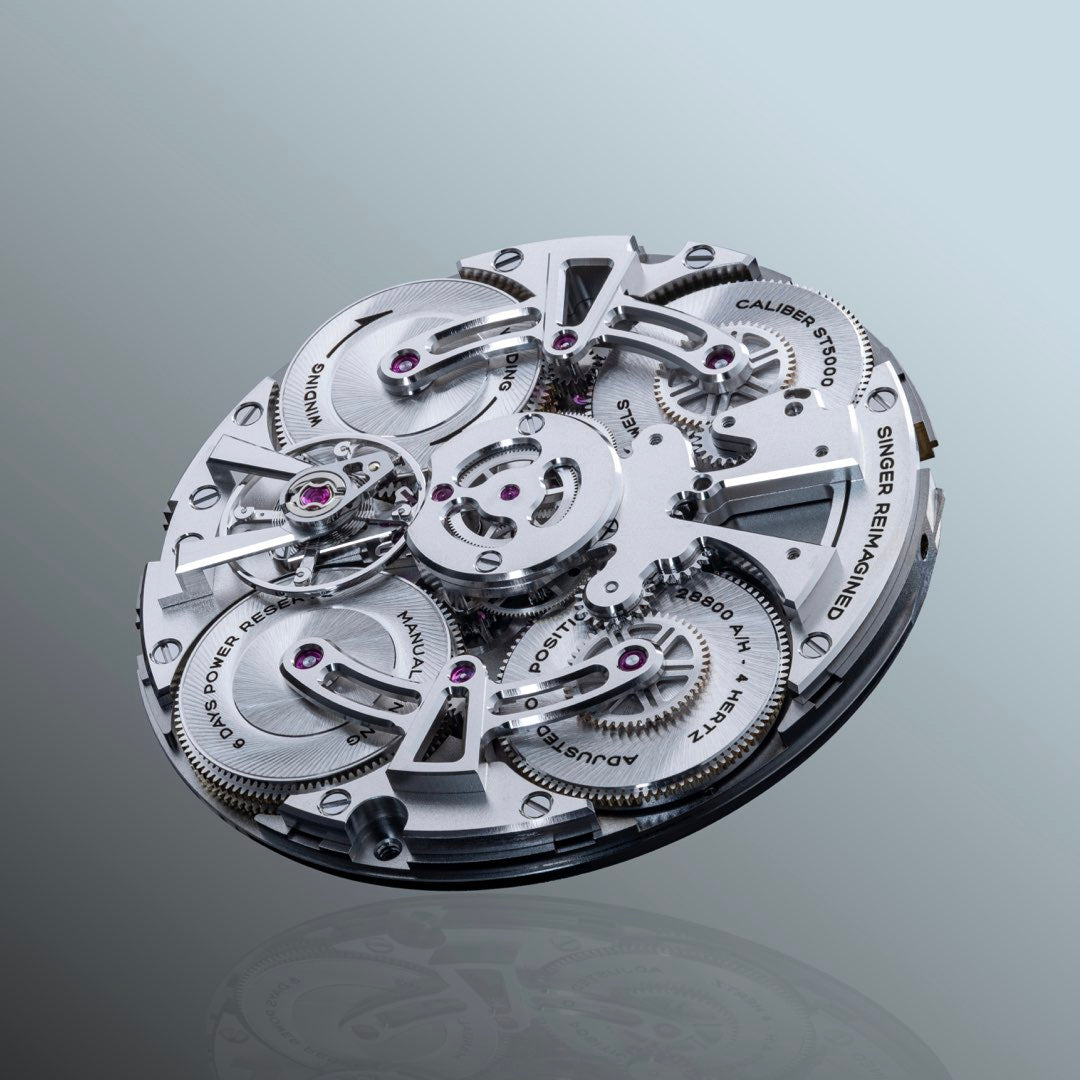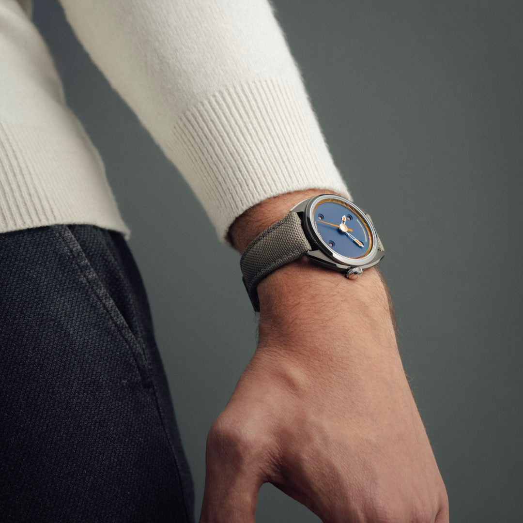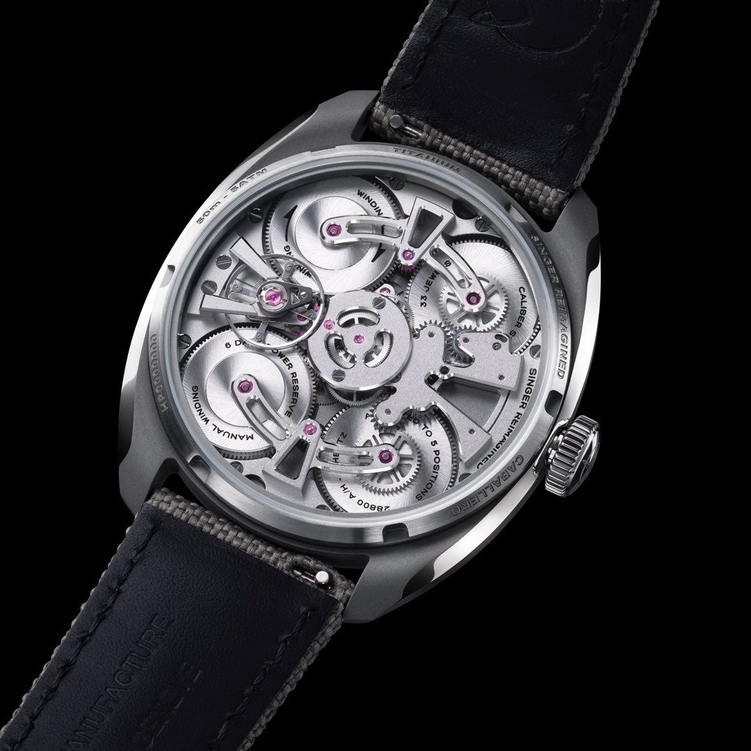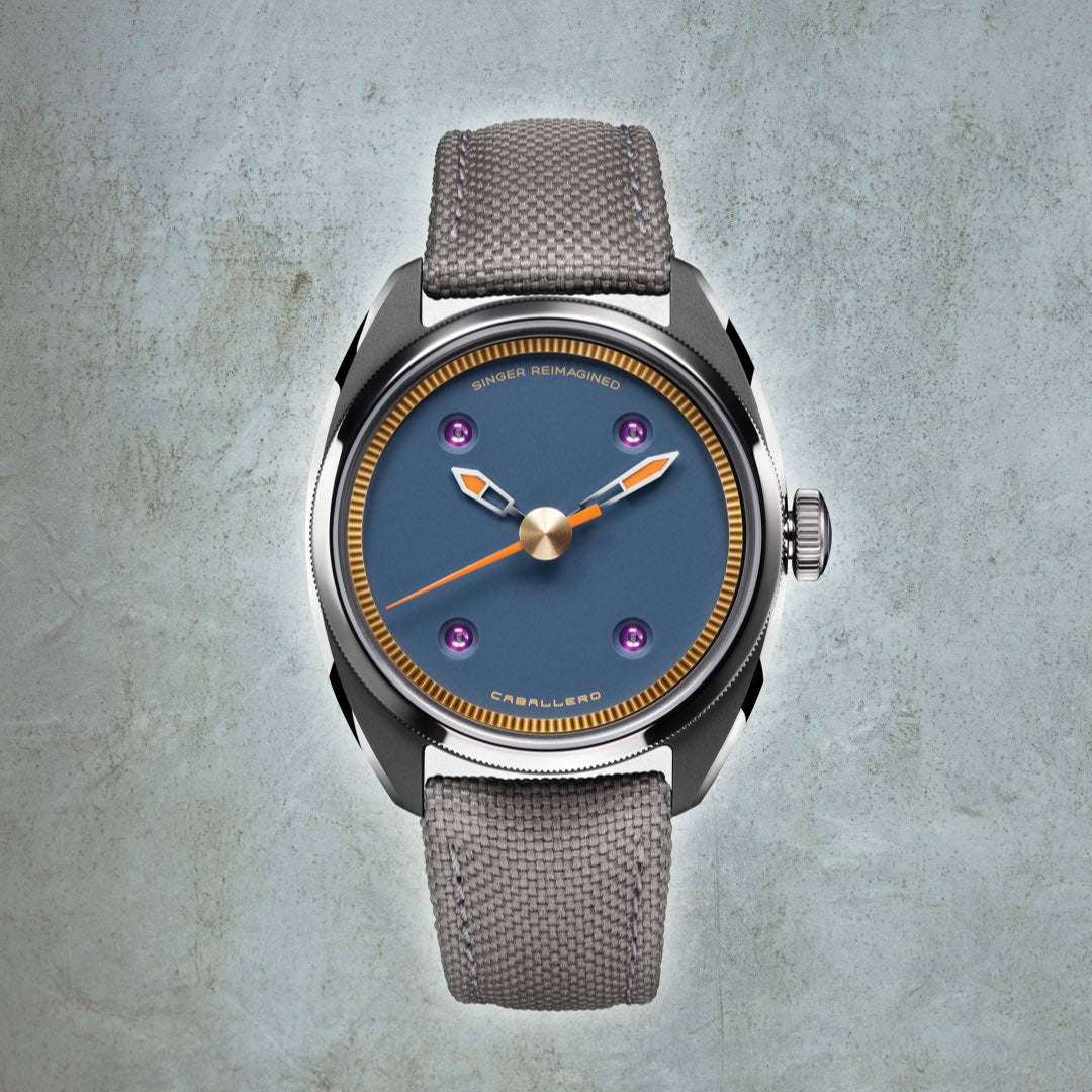 The Singer Reimagined Caballero Titanium puts the brand's 39mm solo tempo into a Grade 5 titanium case defined by the contrast between micro-sandblasted surfaces and mirror-polished edges. Inside, Singer's exclusive Calibre 4 ST — a four-barrel manual-wind movement with a six-day power reserve — is visible through a sapphire caseback. Available in Avio Blue and Cocoa Brown, both with the brand's signature golden flange ring and orange-accented hands, on color-matched textile straps.a